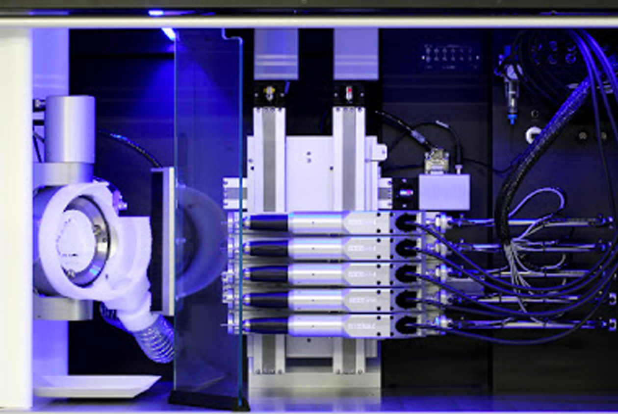Základem je 5-ti osá fréza M5 jež má víceúčelové použití pro korunky a můstky, včetně okluzálně šroubovaných můstků, abutmenty, třmeny, zásuvné spoje, inlaye/onlaye, skusové dlahy, fazety.